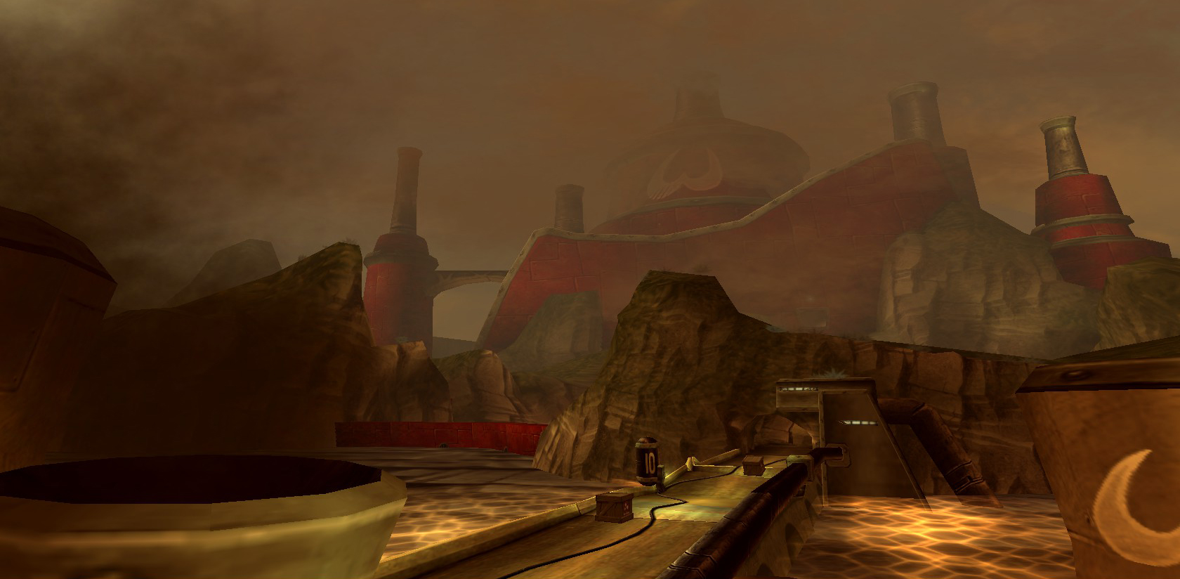 The road leads into Slaughterhouse Quarter, an external waterway protected by mines and torpedo launchers. This leads to a docking station with a giant pair of wheeled gates, which must be opened manually to allow hovercraft access. DomZ Sarcophagi will always materialize to guard these gates.