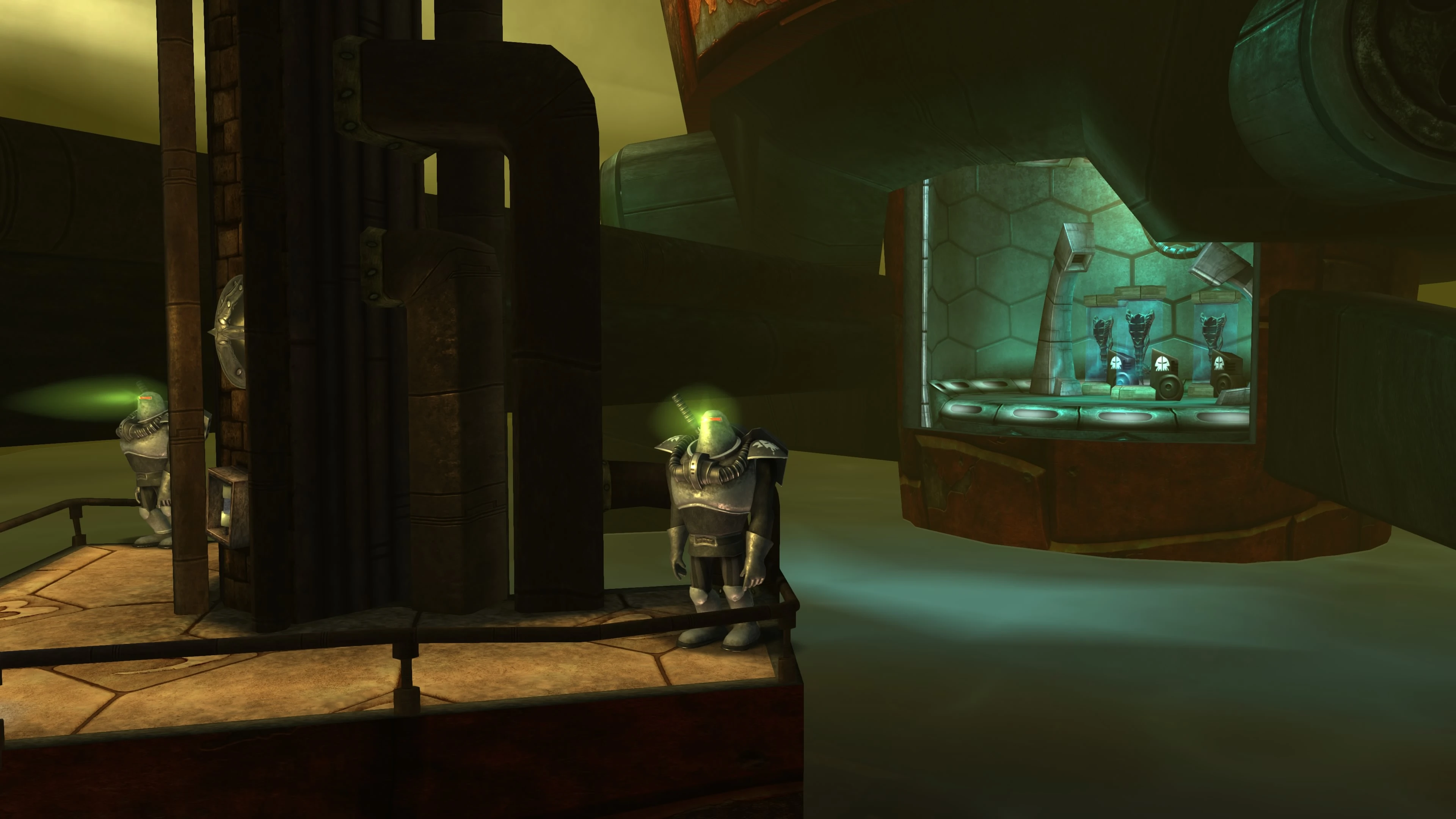 This room is blocked by an electrical barrier, which can only be bypassed by riding the giant portcullis in the adjoining Surveillance Room up to a porthole window passage. The electrical barrier can then be destroyed by knocking the resident Cyclopius Unit M39 into it. A rail car can then be taken from here to Central Hall. From this observation point the tortured Hillyans can be seen being embarked onto Alpha Section cruisers for the DomZ.