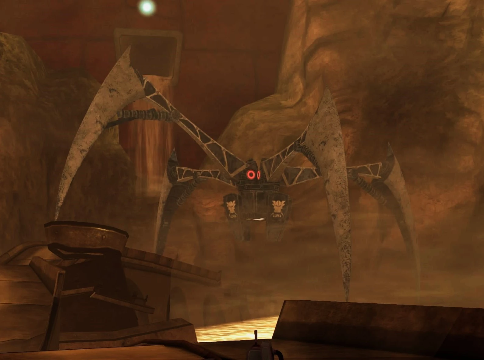 The tunnel leads down onto Slaughterhouse Road, the industrial vehicle access into the complex. The elevated highway is dilapidated and broken apart in sections, requiring the Hovercraft to use its jump kit to cross the gaps. This area is under heavy Alpha Section security, patrolled by a giant spider mech robot. This cannot be defeated and must be swiftly evaded.