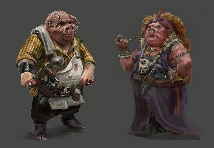The Sus sapiens have large snouts, a pair of floppy ears, and a pair of tusks protruding out of their mouth. It is currently unknown if females also have tusks. Pig humanoids have only three fingers on each hand instead of five. They are usually potbellied or obese and stand slightly shorter than a grown human. Because of their composition, they are restricted in their movements and can't climb over certain obstacles.