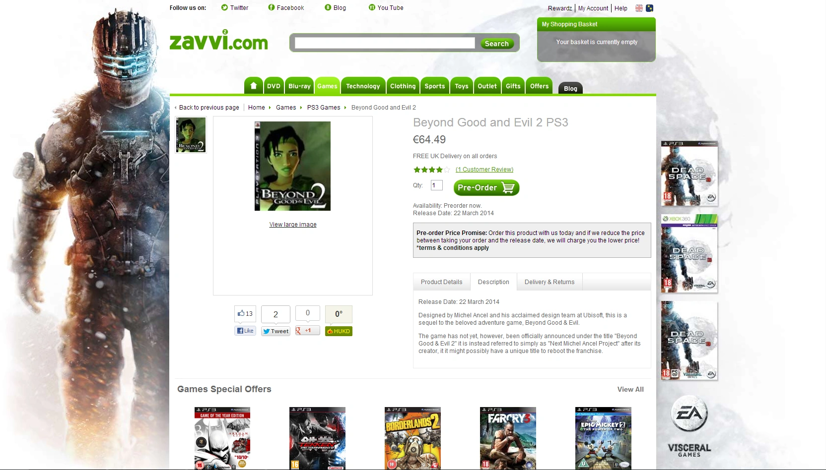 Several websites have stated that the Zavvi.com, the infamous online game retailer, has listed Beyond Good & Evil 2 for pre-order as of last Thursday, along with the release date of the game set on March 22, 2014. The following is a screen capture directly from their website.